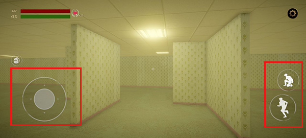 之后可以看到左边轮盘控制角色的移动,右边轮盘可以跳跃、蹲下;