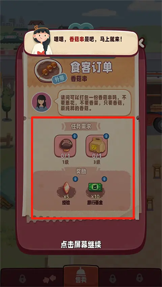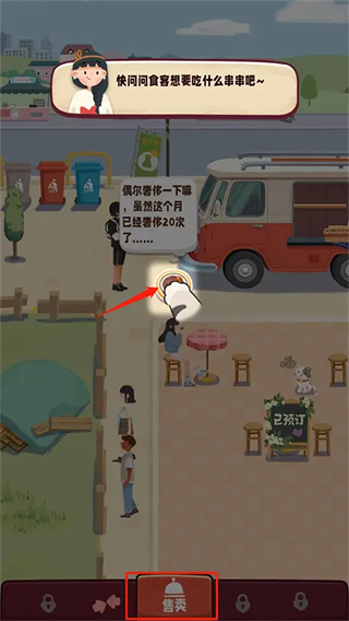 打开旅行串串游戏,进入售卖界面,点击顾客上方的【食物】图标,