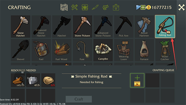 在工具制造页面消耗材料制作鱼竿;