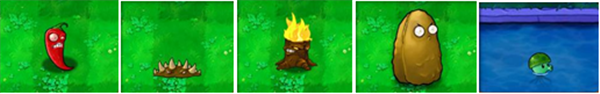 向日葵、豌豆射手、樱桃炸弹、墙果、土豆地雷