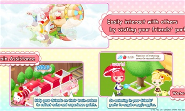 游戏玩法介绍:在进入游戏之后玩家可以建造自己的主题乐园,可爱的凯蒂猫的养成,多种互动剧情故事模式下开始探索,超大的卡通小镇上会有趣许多剧情互动故事。