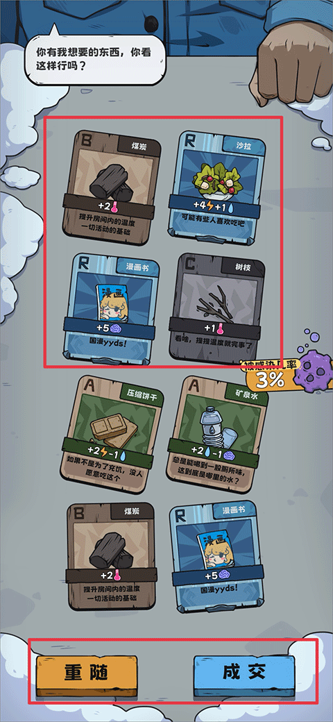 然后对方就会根据你的卡牌来给出他的卡牌,若对对方给出的卡牌满意时可以点击成交,不满意则可以点击重随