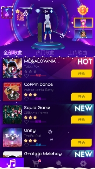 然后返回首页,我们可以看到有全部歌曲、热门歌曲和上传歌曲,玩家可以任意选择自己想要的歌曲,点击开始即可游玩;