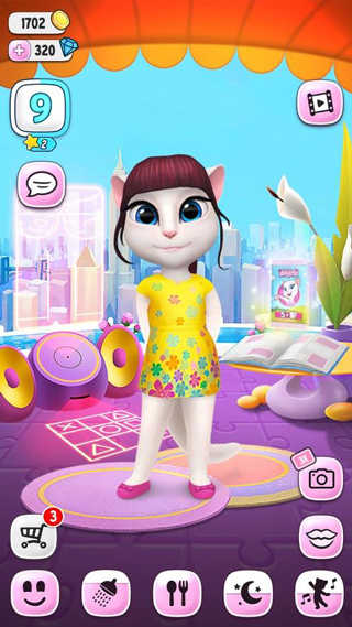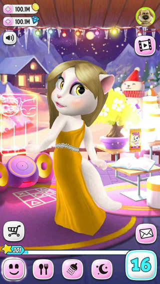 点击音乐按钮,安吉拉跟汤姆猫就会拿起麦克风深情对唱歌曲。