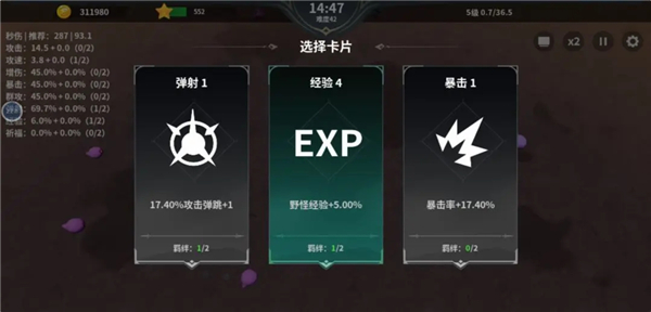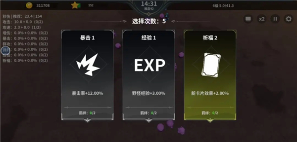 另一个幸存者游戏为玩家提供了攻击、攻速、暴击、增伤、弹射、群攻等8种卡牌类型,经验和祈福可以算作成长类卡牌,其他的都是战力类卡牌,经验祈福主要为玩家提供的是后期能力,而战力卡牌构成了秒伤。所以当玩家的秒伤远高于推荐的时候,选择经验和祈福,否则选秒伤牌,这样才能增大自己的存活几率。