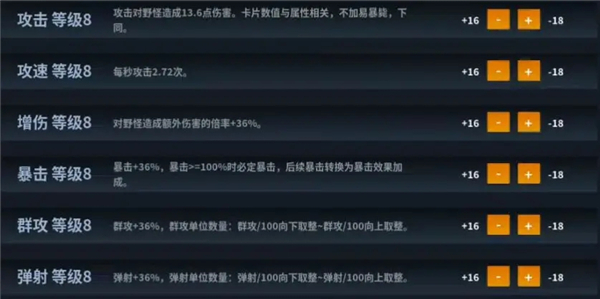 如你如果选择群攻卡片的话,当群攻>=100%时,全功单位数量为:群攻/100向下取整~群攻/100向上取整。群攻上限为1000%,当群攻>=1000%时,剩下的群攻会自动转化为额外伤害,不同的卡片有不同的属性加成;