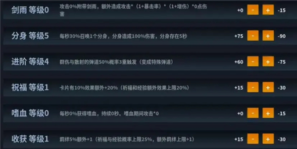 个人建议:前期加点顺序是分身1级、进阶1级、属性点、祝福1级、收获1级、剑雨1级,之后再分身、进阶、属性点不断循环。属性点加多少看你自己喜欢,剑雨看你感觉去加。