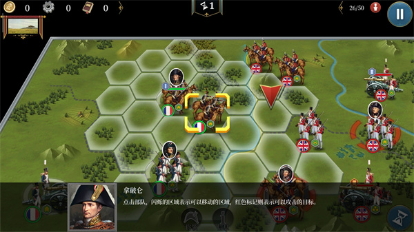 点击部队闪烁的区域表示可以移动的区域,红色标记则表示可以攻击的目标;
