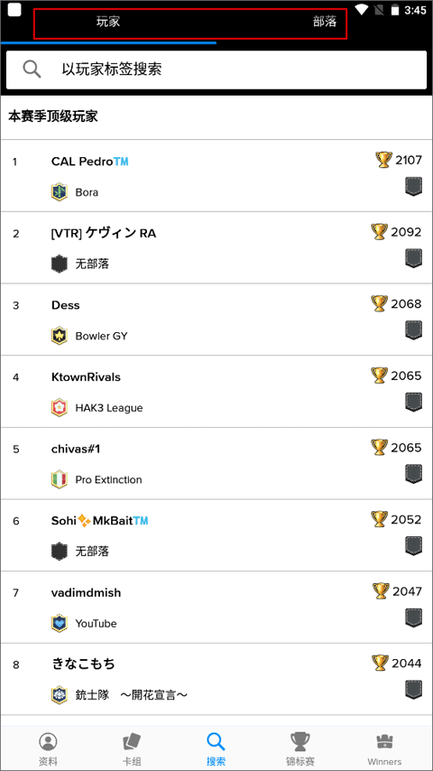 搜索涵盖玩家与部落这两个部分,均借助标签来查找对应的成就、等级等相关信息。