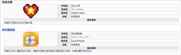 在游戏过程中,玩家可以获得的主要物品是各类食品和收藏品。散布在地图上的食物可以恢复卡比的生命值,不同种类的食物恢复的生命值也不同。而藏在各个箱子中的收藏品,一旦箱子被开启,玩家就能立即获取其中的收藏品。每次收集到一个新的收藏品,游戏的完成度都会有所提升。