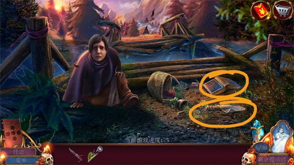 点击场景右边,把野玫瑰种子放地上,吸引鸟,拿起碗,到场景左边河边舀一碗水,返回到第一个场景