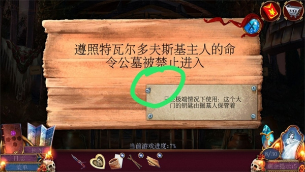 点击公墓,肉铺老板娘正在公墓门口,她走开后,点击公墓大门,大门锁着,需要钥匙打开