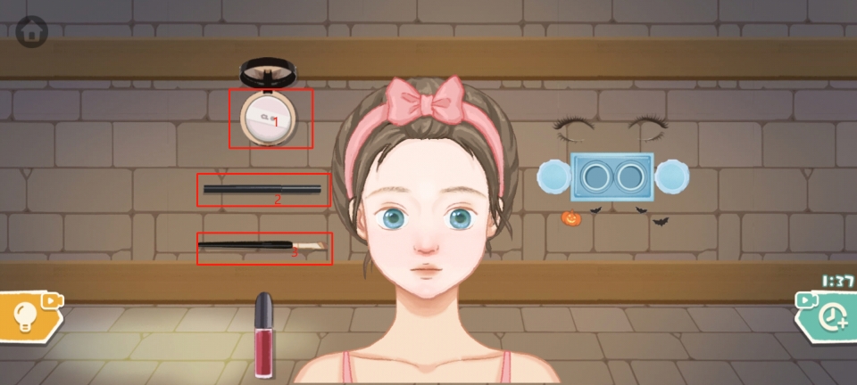 在“一起捣蛋”这一关中,你需要扮演成万圣节的小魔女。开始时,先打开美瞳盒,然后逐个戴上美瞳。