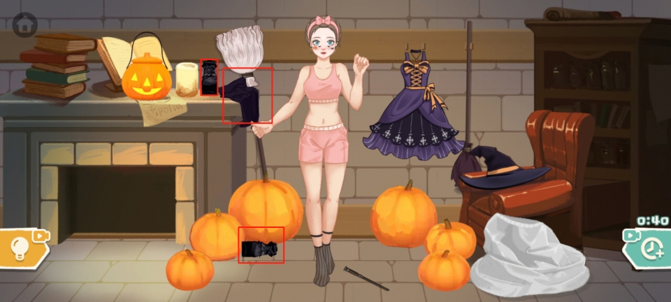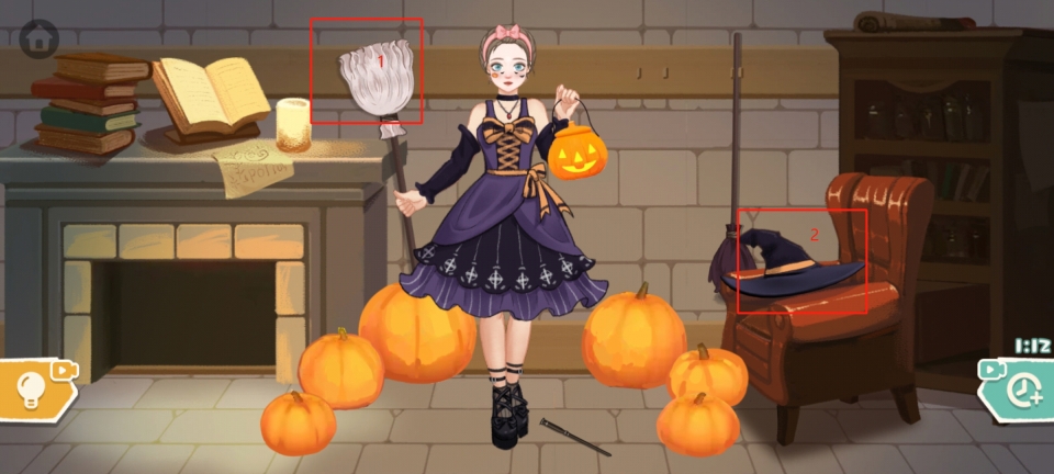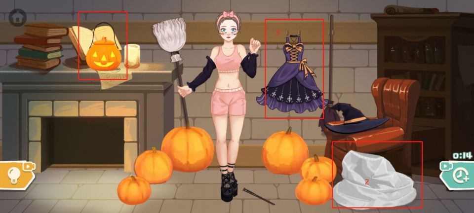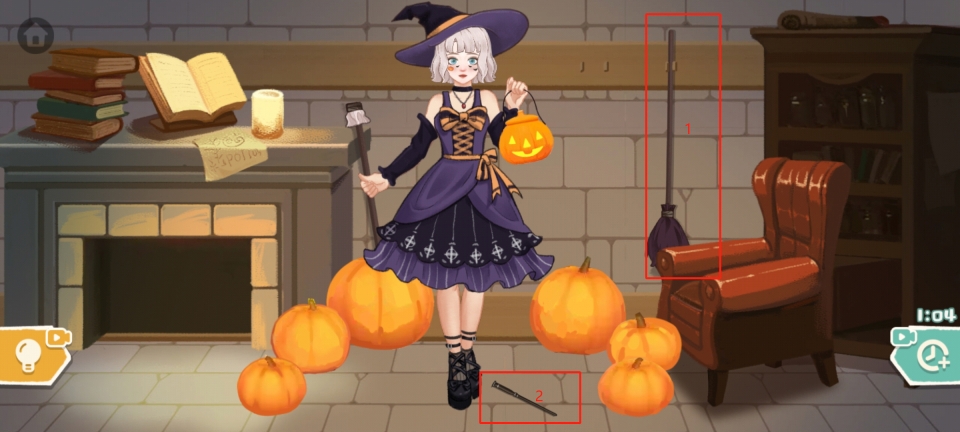 最后把扫帚放到小姐姐的右手,用小刀把周围的南瓜雕成南瓜灯,即可成功通关