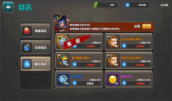 最后就是精华商店了,玩家冒险会额外获得精华,在精华商店把他们用掉吧,免费获取橙将碎片、进化核心、进阶药水等奖励。