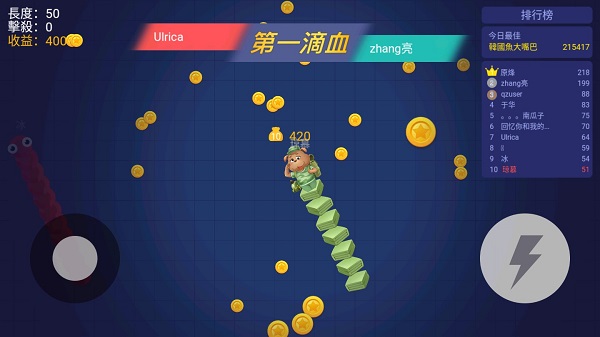 长按加速,用巧妙的走位让蛇身被别人撞上,就可以吃掉对方收集的金币迅速变长。