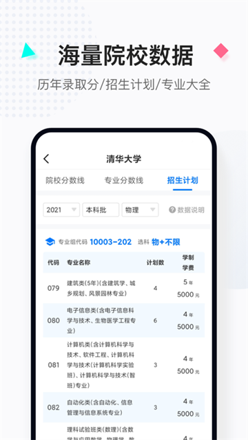 报考大学app提供全方位的志愿填报支持,包括智能院校匹配、专业查询、院校详情展示等功能。用户可以查阅全国2700多所高校的详细信息,了解各校的师资力量、奖学金政策等。软件还特别设置了省控线查询功能,方便考生掌握历年录取分数线变化趋势。