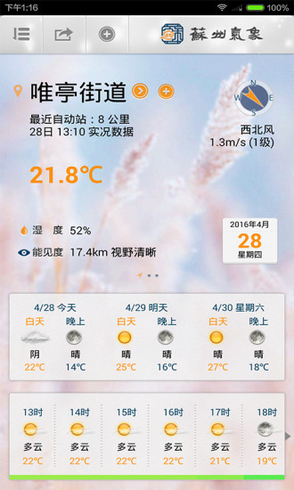 最新5.2.0版本新增了长三角城市群空气质量对比功能,可直观比较苏州与上海、杭州等周边城市的空气质量差异。5.1.8版本重点优化了暴雨内涝风险地图算法,结合城市排水数据提升了预报精度。5.1.5版本接入了江苏省气象大数据平台,实现了全省气象数据的互联互通。5.0.2版本推出的气象+文旅路线推荐,根据实时天气为游客规划最佳游览路线。4.9.7版本新增的电动汽车充电指数,帮助新能源车主选择最佳充电时段。4.8.3版本实现了与苏州地铁的应急联动,遇极端天气可自动推送地铁运营调整信息。4.7.1版本推出的农业大棚气象灾害保险服务,为农户提供气象风险保障。4.6.0版本新增的紫外线实时监测功能,每15分钟更新一次紫外线强度数据。