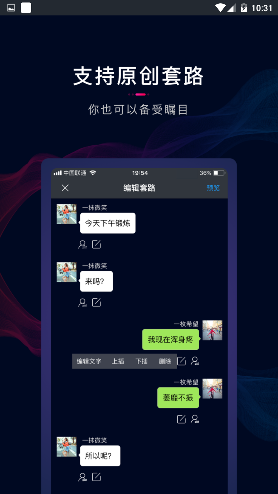 独创沉浸偷窥式体验,就像在偷看别人聊天一样。好玩的、搞笑的、文艺的对话这里都有。系统会智能推荐当前最热门的对话模板,让你第一时间掌握流行趋势,还能根据用户偏好进行个性化推送,确保每次打开都有新鲜感。