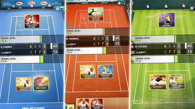 组织召集最好的技术人员–教练,健身教练,男按摩师,心理学家和医生。每个专业人才都将为球员的成长提供独特帮助,比如体能教练能提升球员耐力,心理学家则能稳定比赛心态。锻炼技巧技能,调整你的身心状态,提高你的网球水平。游戏提供了数十种训练项目,从基础击球到高级战术演练应有尽有。获取经验并学习赛事技巧,例如发球和截击,基线防御,杰作等等,这些都将成为你在关键比赛中的制胜法宝。