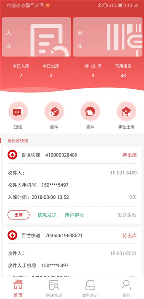 快递入库:支持快速扫描入库,可批量发送取件通知短信,显著节省工作时间;