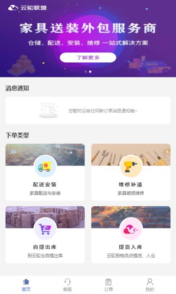 云驼联盟是一款专注于家具行业后端配送服务的综合性平台,旨在为家具生产厂商、经销商、消费者以及第三方物流公司提供高效便捷的一站式解决方案。无论您是家具厂商需要配送安装服务,还是经销商想要优化仓储管理,亦或是消费者希望跟踪订单进度,云驼联盟都能满足您的需求。目前平台支持配送安装、维修补漆、自提出库、提货入库等多种服务,功能全面且操作简单,用户只需在平台上下单即可享受专业服务。快来下载体验,让云驼联盟为您的家具配送保驾护航!