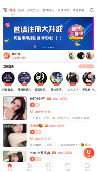 真正的稳定不卡,稳定的音质,流畅的听觉体验,赶快来体验。采用先进的音频压缩技术,即使在网络波动情况下也能保持清晰通话,让每段声音都原汁原味呈现。开启语音连麦,和大咖互动,用声音交友。支持多人同时在线连麦,无论是行业大咖还是兴趣达人,都能零距离交流互动。不看颜值看言值,软萌萝莉音、清冷御姐音、温柔正太音等等。平台独创声纹匹配系统,通过智能算法为你推荐最契合的声线伙伴。全民k歌、吐槽情感、讲鬼故事,各种话题劈开你的脑洞。每日更新热门话题榜单,从娱乐八卦到人生哲学,总有一个频道能激发你的表达欲。
