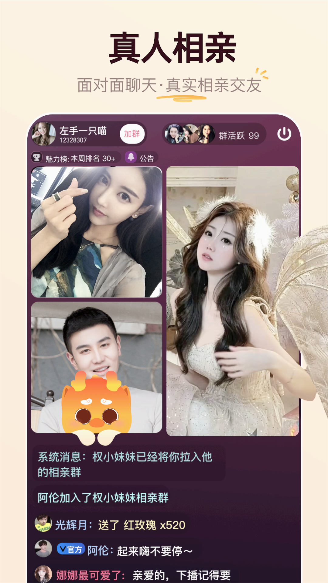 创新的视频相亲模式让你可以实时看到对方的表情和反应,感受最真实的交流体验。平台支持多人互动功能,观众可以在公屏留言互动,营造轻松热闹的氛围。你可以选择上麦直接交流,也可以先观察再决定,完全掌控自己的相亲节奏。