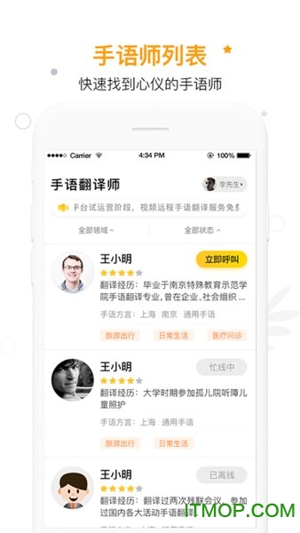 智能手语师匹配系统:应用内置完善的筛选机制,可根据地理位置、服务领域、用户评价等多维度参数,帮助用户快速找到最适合的手语翻译师。