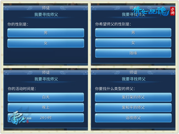 为了帮助大家找到最搭调的师傅/徒弟,在拜师/求徒时有许多问题需要大家选择。这些问题涵盖游戏风格、上线时间、社交偏好等多个维度,确保师徒双方志趣相投。