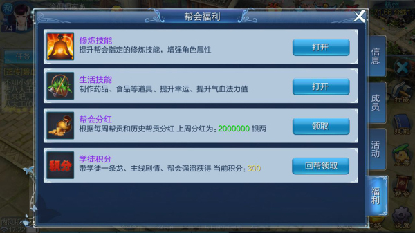 帮会中还为帮众提供了各种福利,如领取分红。随着帮会等级的提升,成员可享受的福利也会越来越多,包括专属装备、稀有道具等珍贵奖励。