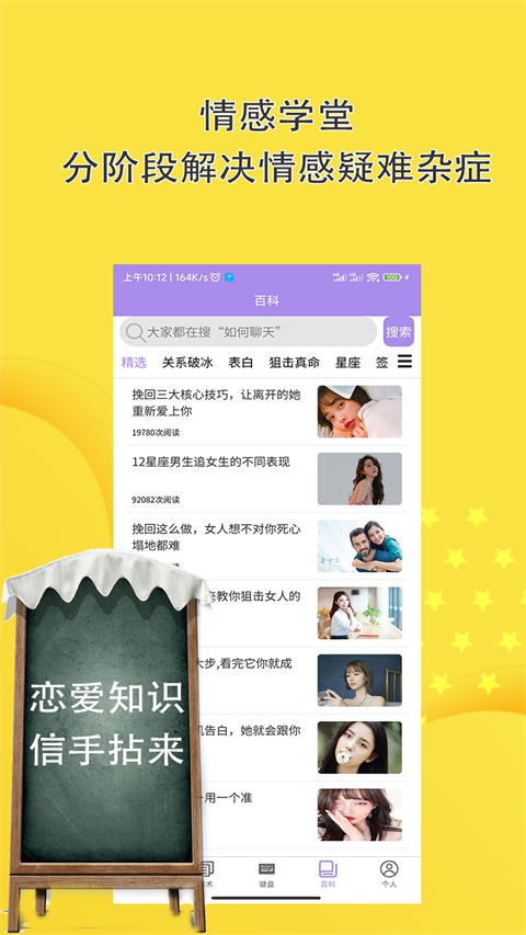 情感领域的百科全书,快速成为情感达人。这个板块收录了2000+条情感知识词条,内容涵盖心理学理论、沟通技巧、肢体语言解读等,支持关键词检索和分类浏览。