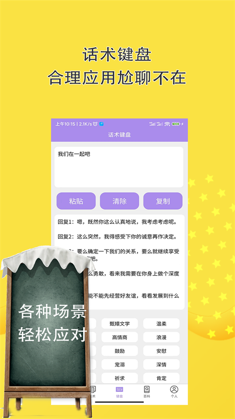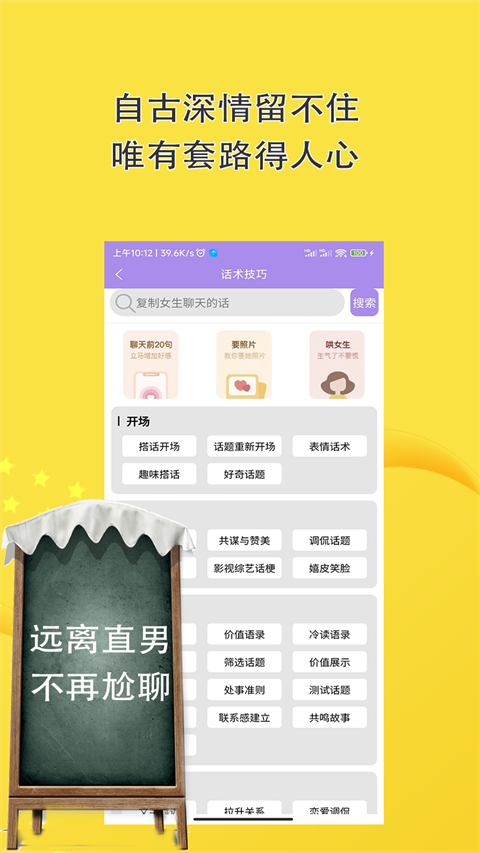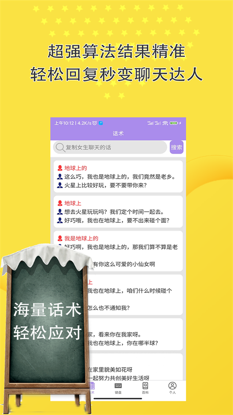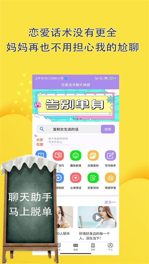 百万恋爱聊天话术高情商回复女生说的话,快速帮你提高恋爱情商。新版本优化了智能推荐算法,新增了2000+最新话术案例,改进了社区互动功能。如果你不知道如何和女生聊天沟通,就快来下载这款恋爱话术聊天神器吧。