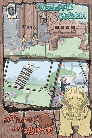 玩家在游戏里面将会穿越到过去,你会见识到各种让你感到非常惊讶的情景,不一样的蒙娜丽莎和新奇的狮身哈士奇面像,都是新的场景,但是所有都在变化的情境下,都不能改变历史,在这个过程你会遇到很多古怪的事情发生,你要想办法帮助度过难关哦。游戏采用独特的"历史修复"机制,玩家需要在不改变历史大事件的前提下,解决各种突发状况。从帮达芬奇找回丢失的画笔,到协助埃及工匠完成狮身人面像的建造,每个任务都充满趣味性和挑战性。随着游戏进程,玩家将解锁更多历史时期和场景,体验一场跨越千年的欢乐冒险。