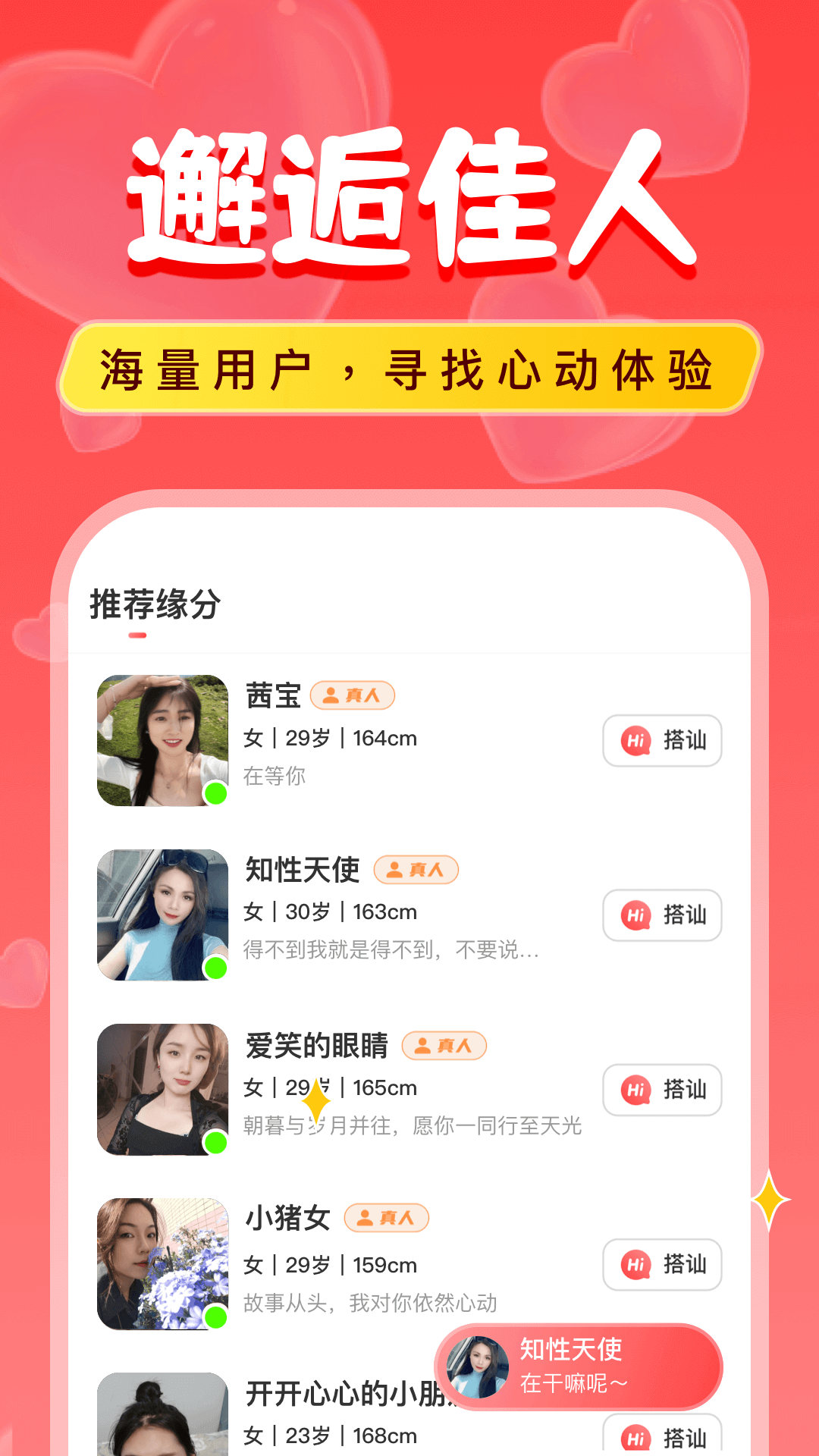 附近陌爱探聊以语音聊天作为破冰起点,让你在轻松自然的氛围中认识新朋友。系统会根据你的位置信息智能推荐同城用户,大大增加了线下见面的可能性。软件汇集了来自全国各地的优质用户,你可以根据自己的喜好选择不同类型的聊天伴侣,无论是寻找知性伙伴还是活泼开朗的对象,都能在这里找到心仪之选。特别值得一提的是,软件独创的"心动模式"能根据你的聊天习惯自动优化匹配策略,让每次相遇都充满期待。