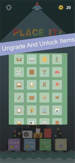 《PlaceIt》是一款充满创意与挑战的休闲物理闯关手游,以其独特的重力玩法为核心,带给玩家别具一格的游戏体验。游戏采用精致的像素风格画面,玩家需要精准预测重力趋势,将各种家具和物品堆叠到指定位置。无论是经典的堆箱子玩法,还是更具难度的家具堆叠挑战,都能让你感受到物理学的魅力。游戏还提供无尽模式,让你在赚取金币的同时不断突破自我。操作简单却极具策略性,适合在碎片时间放松娱乐。快来加入这场平衡与智慧的较量吧!