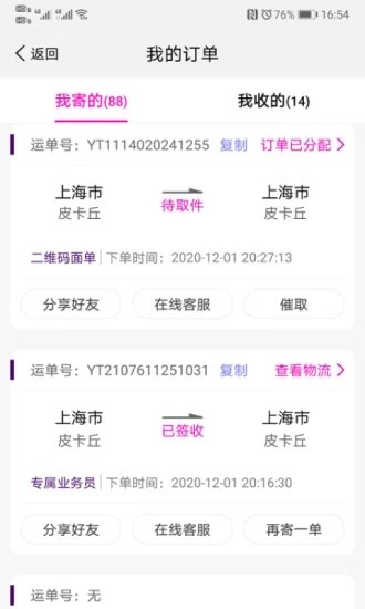 我的订单:详细记录最近1个月内的手机订单,支持订单状态实时更新,可进行撤销、绑定、评价等操作。