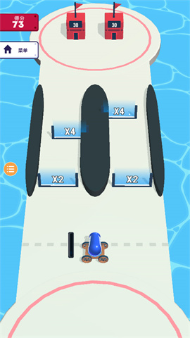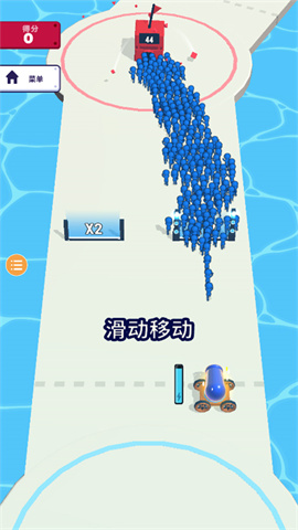 进入关卡后可以看到一门大炮,这是唯一的控制点,滑动大炮可移动位置,建议优先占据地图中央制高点。按住大炮不放即可持续发射炮弹人,经过倍数门会增加士兵数量,建议优先朝倍数高的门发射,但要注意敌方在必经之路设置的埋伏。随着不断发射炮弹人,能量条也会持续累积,能量条满后会变为黄色状态,此时屏幕会出现特效提示。此时松开大炮,会发射出更强大的黄色巨人,经过倍数门也能增兵,巨人可一次性摧毁低级防御工事。当炮弹人相遇时会互相抵消,通过第二个回合后,再获得一个回合胜利便可成功过关,建议在兵力优势时发动总攻。成功突破敌人封锁,抵达敌方大本营时便算通关。在倒计时结束前,让更多炮弹人进入敌营可获得更多奖励,每多10个士兵奖励提升一档。通关后还有奖励翻倍的机会,通过观看广告可获得双倍钻石。获得的钻石可以在主界面建筑建设,完成后将解锁下一个场景,不同场景会解锁特殊兵种。