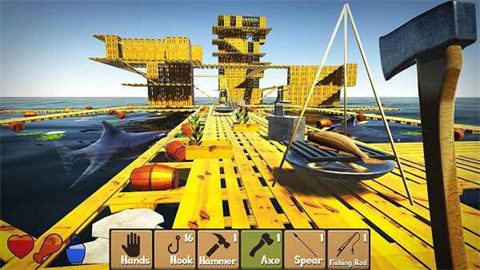 工具制作是生存的核心,建议优先解锁基础工具配方。斧头不仅能砍树,还能拆除不需要的建筑结构。鱼竿可以钓到各种海鱼,是稳定的食物来源。建造锤是扩建木筏的必备工具,建议多准备几把。初始钩子虽然简陋,但经过升级后可以大幅提升收集效率。矛是前期对抗鲨鱼的最佳选择,建议随身携带。