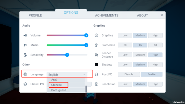 进入游戏之前,我们可以进行声音、音乐、灵敏度、图表、框架、渲染、阴影等选项的设置,